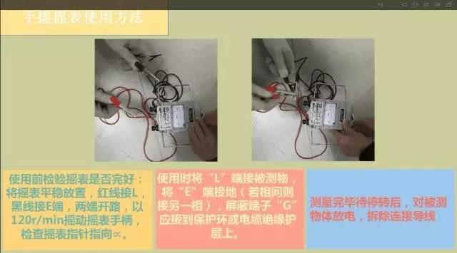 兆歐表有手搖式搖表與電子搖表,并設有不同的電壓等級:400V及以下選擇500V搖表,1KV-6KV選擇2500V搖表。測絕緣時應按設備電壓等級正確地選擇搖表。在測量之前檢驗被測設備是否帶電,保證人身安全,若帶電則應終止操作,在將帶電設備斷電隔離后才可進行測絕緣操作。400V設備可用驗電筆或萬用表進行驗電。大于或等于1KV的用高壓驗電器進行驗電。高壓驗電器分為不同電壓等級,其絕緣桿長度隨電壓等級升高而升高,絕緣特性隨電壓等級升高而升高,因此在選用驗電器時要注意,若所選驗電器絕緣等級不夠會有觸電的危險。