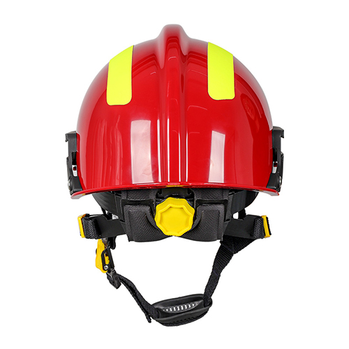 佩戴裝置:包括帽箍和系帶,耐高溫阻燃材質。在盔體后沿下側設頭圍調節旋鈕;系帶可調節佩戴松緊,加裝帶孔透氣下頦托;插扣為快脫插扣;
